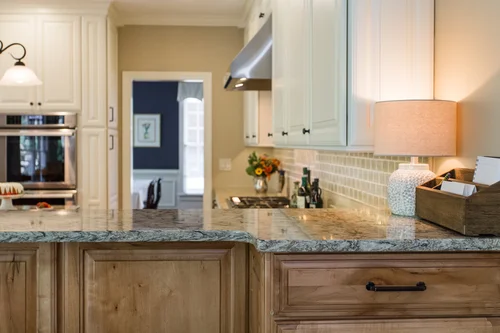 This builder grade kitchen was due for a complete makeover. We kept the same footprint because it was very functional and met all of the homeowner’s needs. The addition of new and improved cabinetry increased the functionality of this space even more. We faced the back of the peninsula with beautiful hardwood that add warmth to the room, and blends nicely with the family room it faces. The clutter at the end of the island has been completely eliminated. We provided the homeowner with drawers, and a base cabinet with pull-out shelves for easy access to paperwork and the other “stuff of life” that we all accumulate.